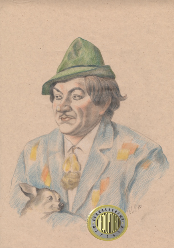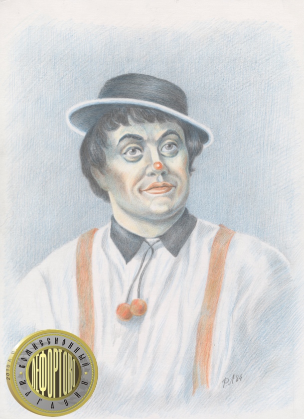 Клоун Вяткин Б, шарж-художник Левицкий Р. В. Театральный художник Левицкий Роман Васильевич 1920 - 1991 гг. Жил и работал в Санкт - Петербурге. Член: СХ СССР, ВТО, союза журналистов. Рисовал актеров 30 лет: за кулисами театров, концертных залов, цирков и варьете. Уникальное собрание насчитывает 1200 портретов: актеров, режиссеров, работников цирка и зарубежных гастролеров из сорока стран мира. Техника: цветной карандаш, литография, рисунок пером, акварель. В коллекции художника есть портреты великих актеров прошлого и настоящего. Работы Романа Васильевича не однократно выставлялись на персональных выставках: Санкт - Петербург 1972 - 1982 г.г. Москва - 1976 г., Дом актера, ЦДРИ - 1977г. Дом журналиста 1982 г. Краснодар - 1978 г., 1979 г. Сочи - 1979 г., Издательство " Изобразительное искусство " выпустило наборы открыток Р. В. Левицкого: 1. " Островский в Малом театре ", 2. " МХАТ - актеры и образы ", 3. " Клоуны Советского цирка ". Четвертую часть коллекции Р. В. Левицкий принес в дар городу Санкт - Петербург. Часть коллекции находится в Бахрушинском музее. Часть работ Р. В. Левицкого находятся в частных коллекциях ведущих деятелей искусства.