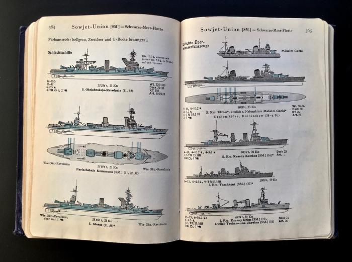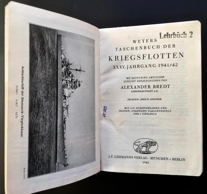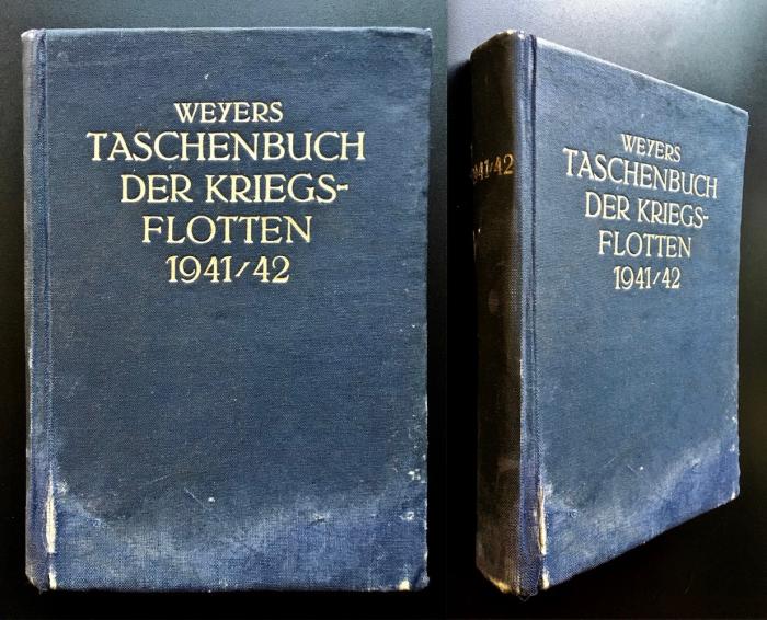 2) [На нем. яз. А. Карманный справочник военно-морского флота Вейера. Выпуск ХХХ за 1941/42 год]. Bredt, A. Weyers Taschenbuch der Kriegsflotten. XXX. Jahrgang 1941/42. - Munich-Berlin: J.F. Lehmanns Verlag, 1941. - 444, [46] с. ил., [рекл. объяв.]; 17,5 Х12,5 см.;