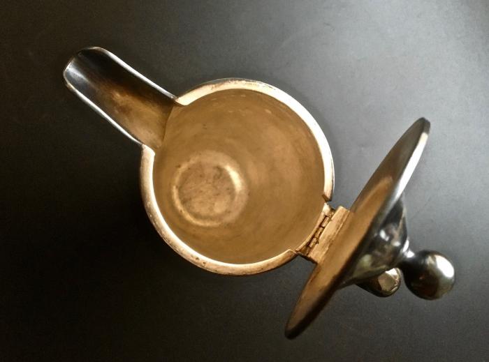 Серебряная отделка покрыта густой патиной. Нижний край имеет маркировку производителя “GEBR. HEPP 90¹ дно Haus Gotha Высота: 16 см. Объём: 250 мл. Состояние: Отличное.