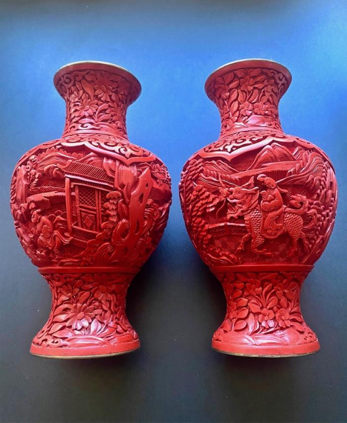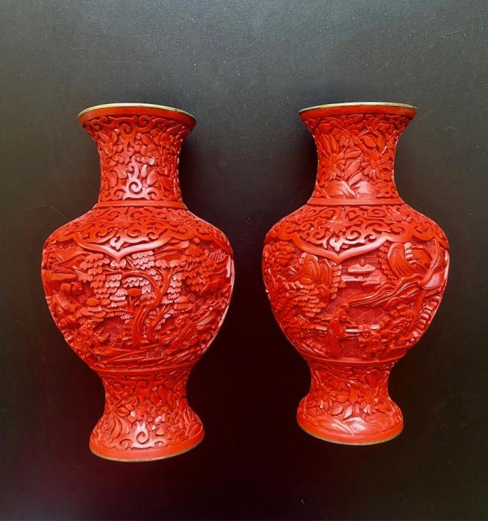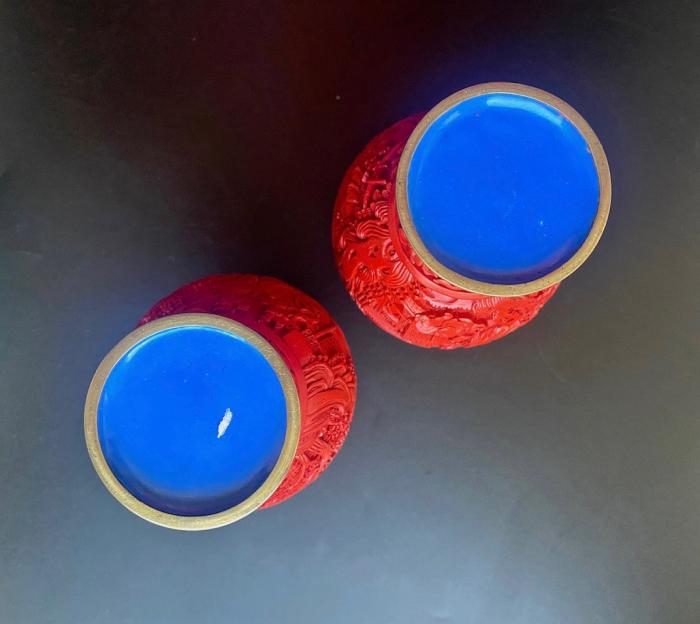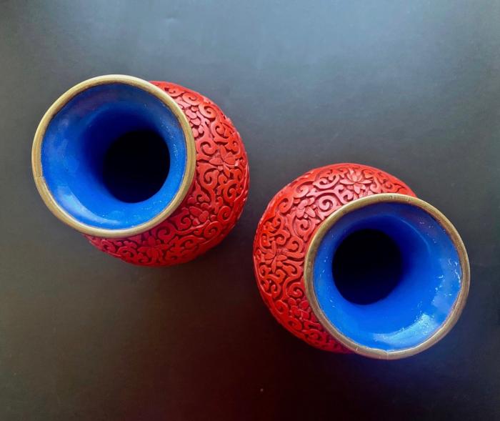 Парные настольные вазы, Китай середина ХХ века. Материал: латунь, красный лак. Высота: 16, 5 см. Состояние: Без дефектов.